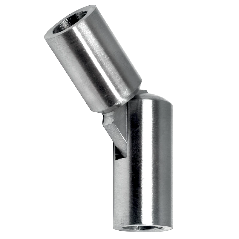 Die Konstruktion besteht aus zwei Hülsen mit je 30 mm Länge, die durch ein Gelenk verbunden und mit Inbusschrauben gesichert sind. Die Montage erfolgt durch Einschrauben — die Stange ø 12 mm wird in die Hülse eingeschoben und durch Anziehen der Schraube blockiert, was eine schnelle und sichere Montage ohne Spezialwerkzeug gewährleistet.