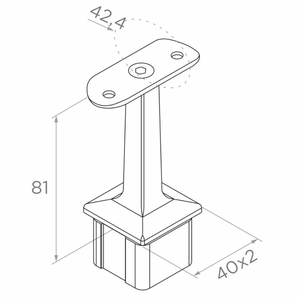 Die Halterung ist für die Verwendung in Geländersystemen bestimmt, die auf quadratischen Pfosten 40×40 mm mit Rohrhandlauf Ø42,4 mm basieren. Der Zapfen mit Querschnitt 14×14 mm wird in das Innere des Pfostens eingeschoben und mit anaeroben Kleber fixiert, wodurch die Notwendigkeit von Schweißarbeiten auf der Baustelle entfällt und die Montage erheblich beschleunigt wird. Die Lösung bewährt sich besonders bei Balkon-, Terrassen- und Treppengeländern, wo eine steife und ästhetische Konstruktion erforderlich ist.