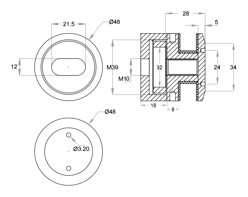 Runder Punkthalter Ø 48 mm zur Befestigung von Glas in Edelstahlgeländern — entwickelt für die Montage auf flachen Oberflächen. Hergestellt aus rostfreiem Edelstahl AISI 304 in satinierter Ausführung, verbindet Ästhetik mit hoher Korrosionsbeständigkeit. Dank des Schlüsselsystems (Bolzenlöcher Ø 3,20 mm) gewährleistet eine sichere und verstellbare Befestigung von Scheiben mit einer Dicke von 8 bis 16,76 mm.