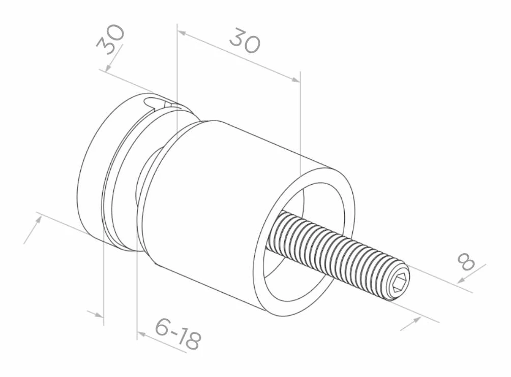 Punkthalter für Glas aus Edelstahl AISI 304 in Satinausführung — ein solides Befestigungselement zur Montage von Glasscheiben mit einer Dicke von 6 bis 18 mm auf ebenen Flächen. Der präzise gedrehte Korpus mit einem Durchmesser von 30 mm und Gewinde M8 gewährleistet eine sichere und dauerhafte Befestigung von Glaspaneelen sowohl im Innen- als auch im Außenbereich.