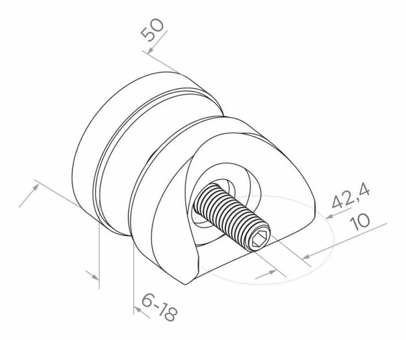 Punkthalter für Glas mit Durchmesser 50 mm aus nichtrostendem Edelstahl AISI 304 mit satinierter Oberfläche. Geeignet zur Befestigung von Glasplatten mit einer Dicke von 8 bis 17,52 mm an einem runden Rohr mit Durchmesser 42,4 mm. Durch die Verwendung von säurebeständigem Edelstahl eignet sich der Halter sowohl für Innenanwendungen als auch für den Außenbereich – in Terrassen- und Balkongeländern, Treppenhäusern sowie Glasüberdachungen.