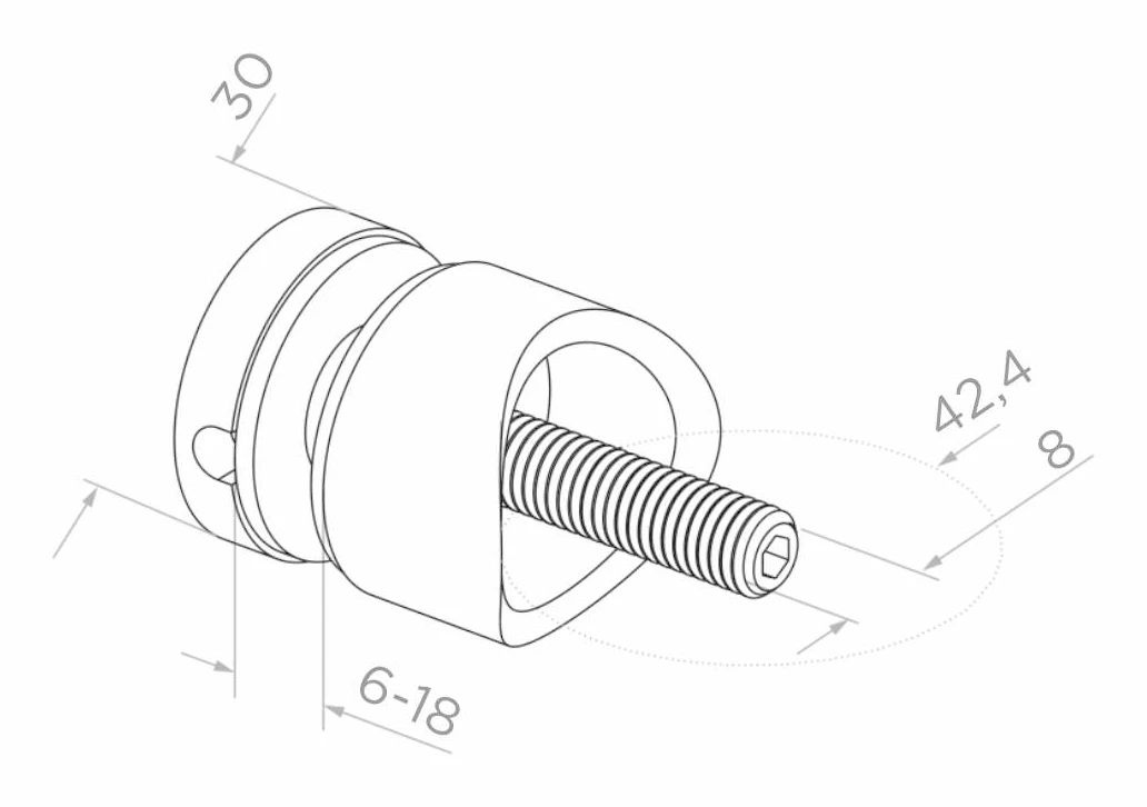 Die Rotula unterstützt und stabilisiert die montierte Glasscheibe perfekt. Dank mitgelieferter Druckgummis gewährleistet die Halterung einen elastischen und sicheren Anpressdruck, der die Glaskanten vor Beschädigungen schützt. Der Einstellbereich für die Glasdicke beträgt 6–18 mm, was eine große Anwendungsvielseitigkeit bietet — von dünnen Dekorationspaneelen bis zu dickeren Geländerglasscheiben. Das Befestigungselement ist mit einem M8-Gewinde ausgestattet, was eine sichere und stabile Befestigung an der Tragkonstruktion garantiert.
