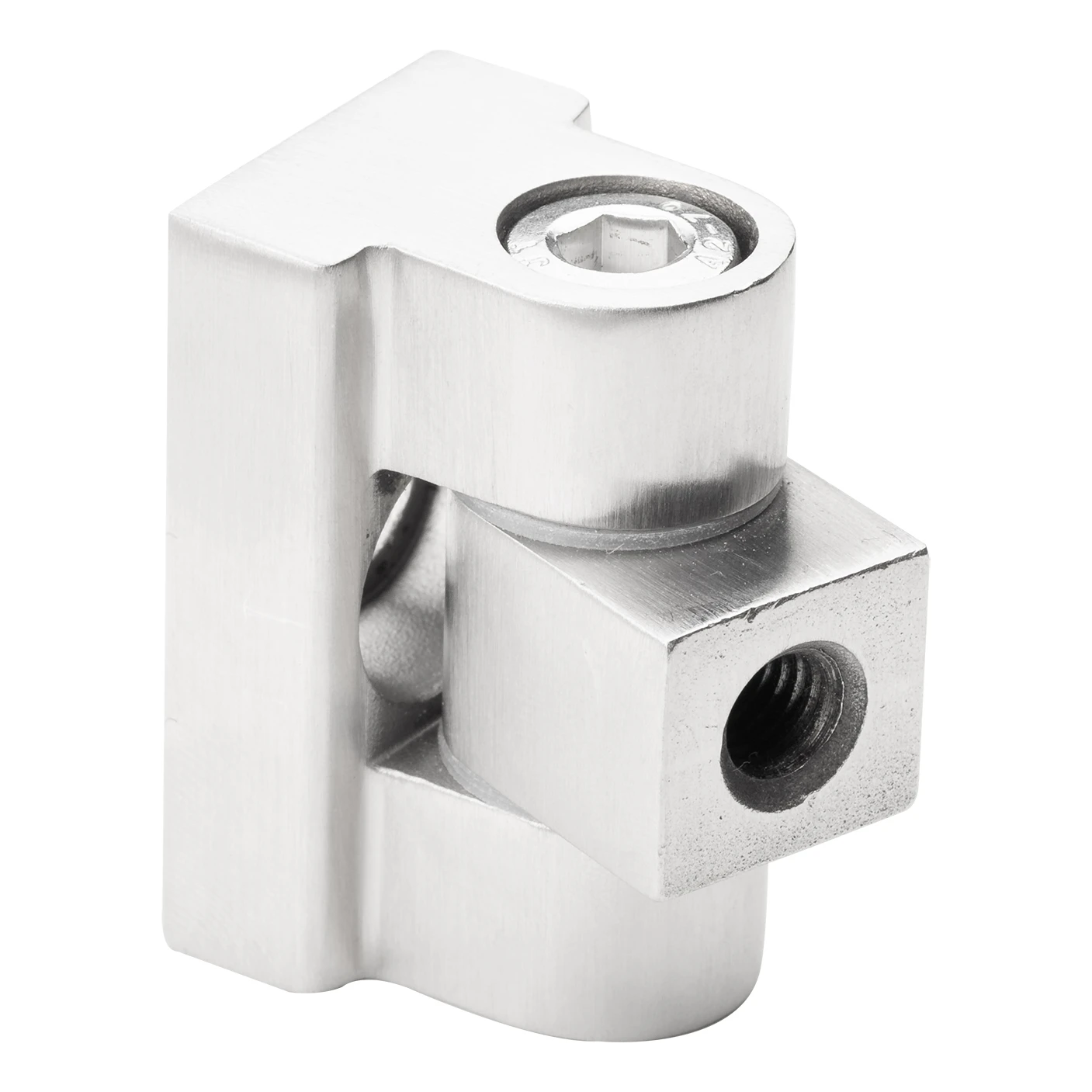 Scharnier 180° für Glashalter aus Edelstahl AISI 304 mit Satin-Finish — präzises Verbindungselement für Glasgeländersysteme montiert auf Rohren mit Durchmesser 42,4 mm. Dank des vollen Drehbereichs von 180° (2 × 90°) ermöglicht es eine stufenlose Winkelverstellung der Glaspaneele, was die Montage an ungewöhnlichen Konstruktionsformen erheblich erleichtert.
