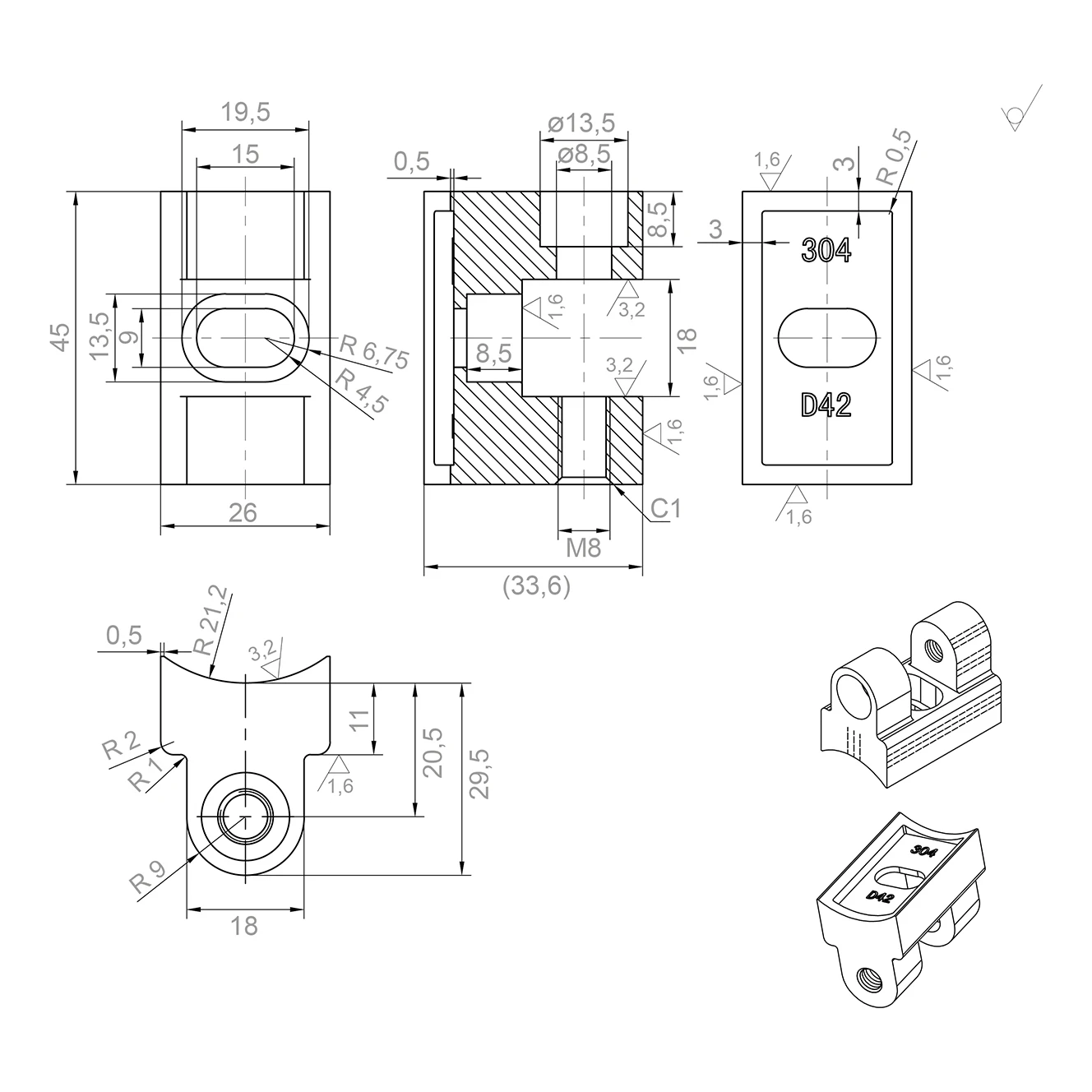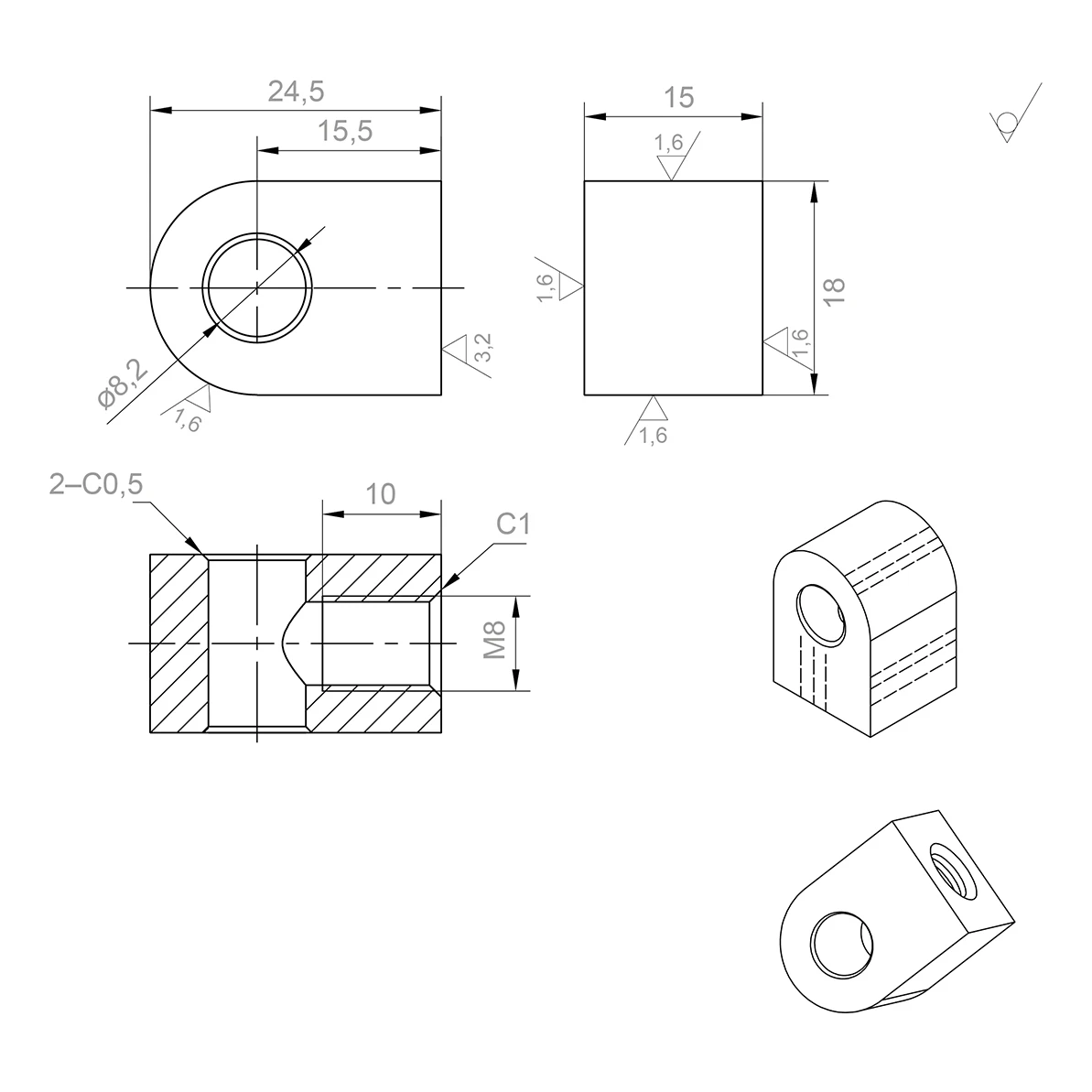 - Anfasungen: 2×C0,5 am Auge, C1 an Gewindebohrungen