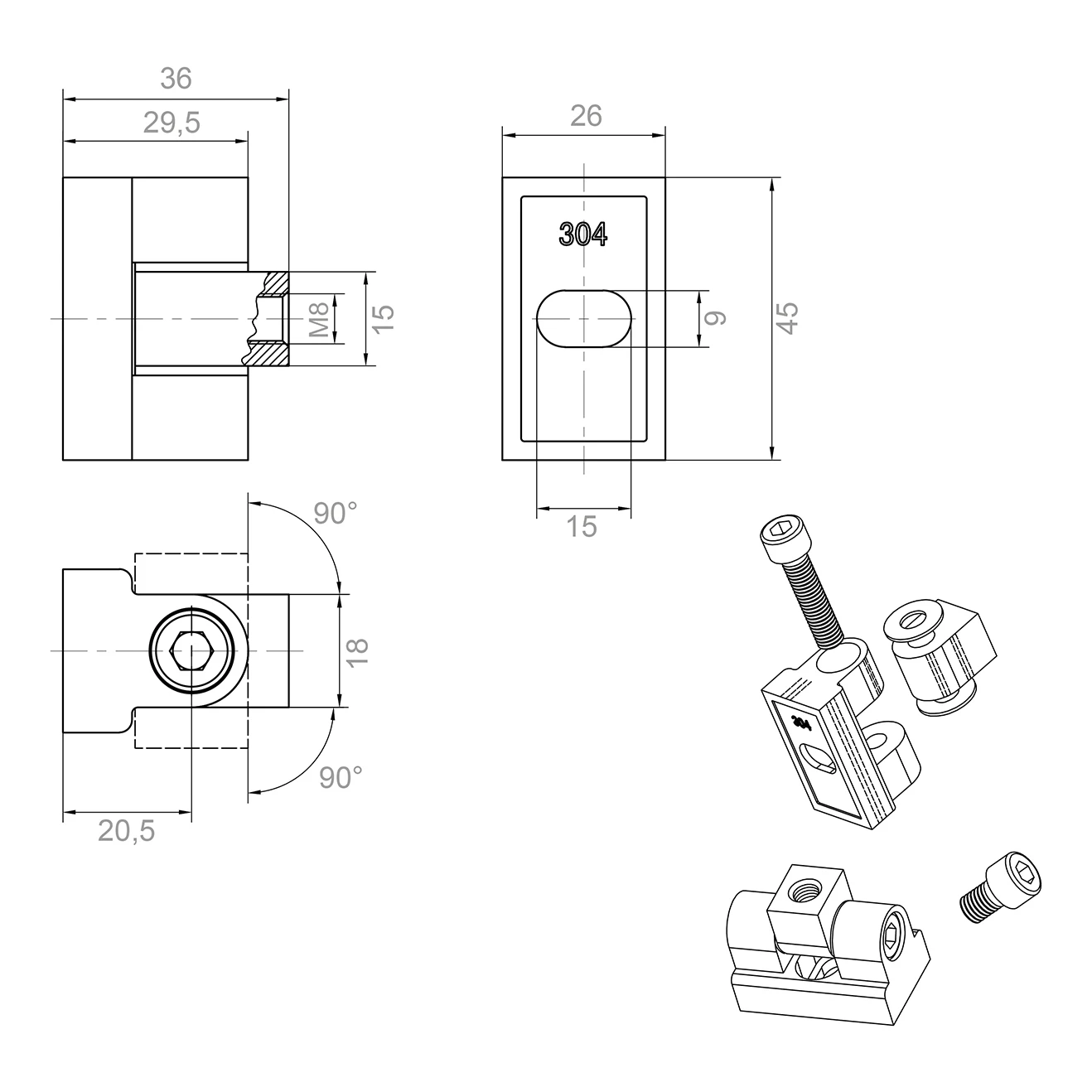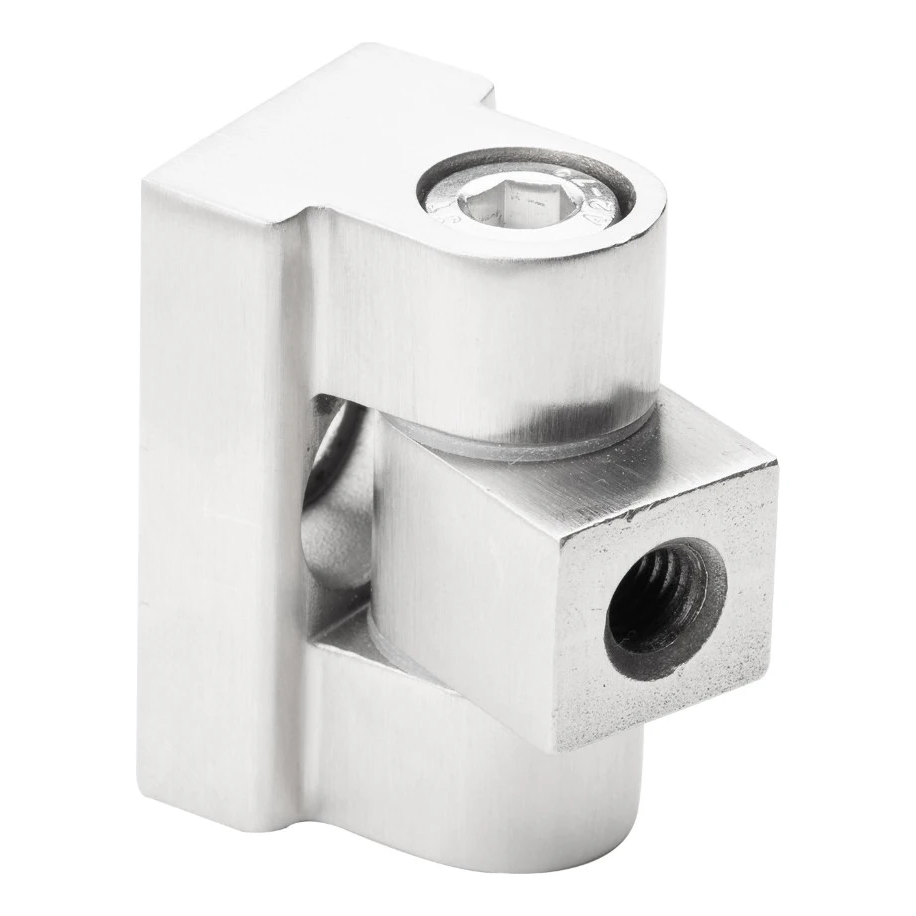 Das Scharnier wird an flachen Oberflächen durch Verschraubung mit M8-Gewinde montiert. Diese Methode gewährleistet eine hohe Verbindungsfestigkeit, einfache Installation und eventuelle Demontage — ohne die Notwendigkeit von Spezialwerkzeugen. Das Langloch im Gehäuse ermöglicht eine Positionsverstellung des Glases im Bereich von 9 mm, was eine präzise Einstellung der Glasscheibe während der Montage erleichtert.