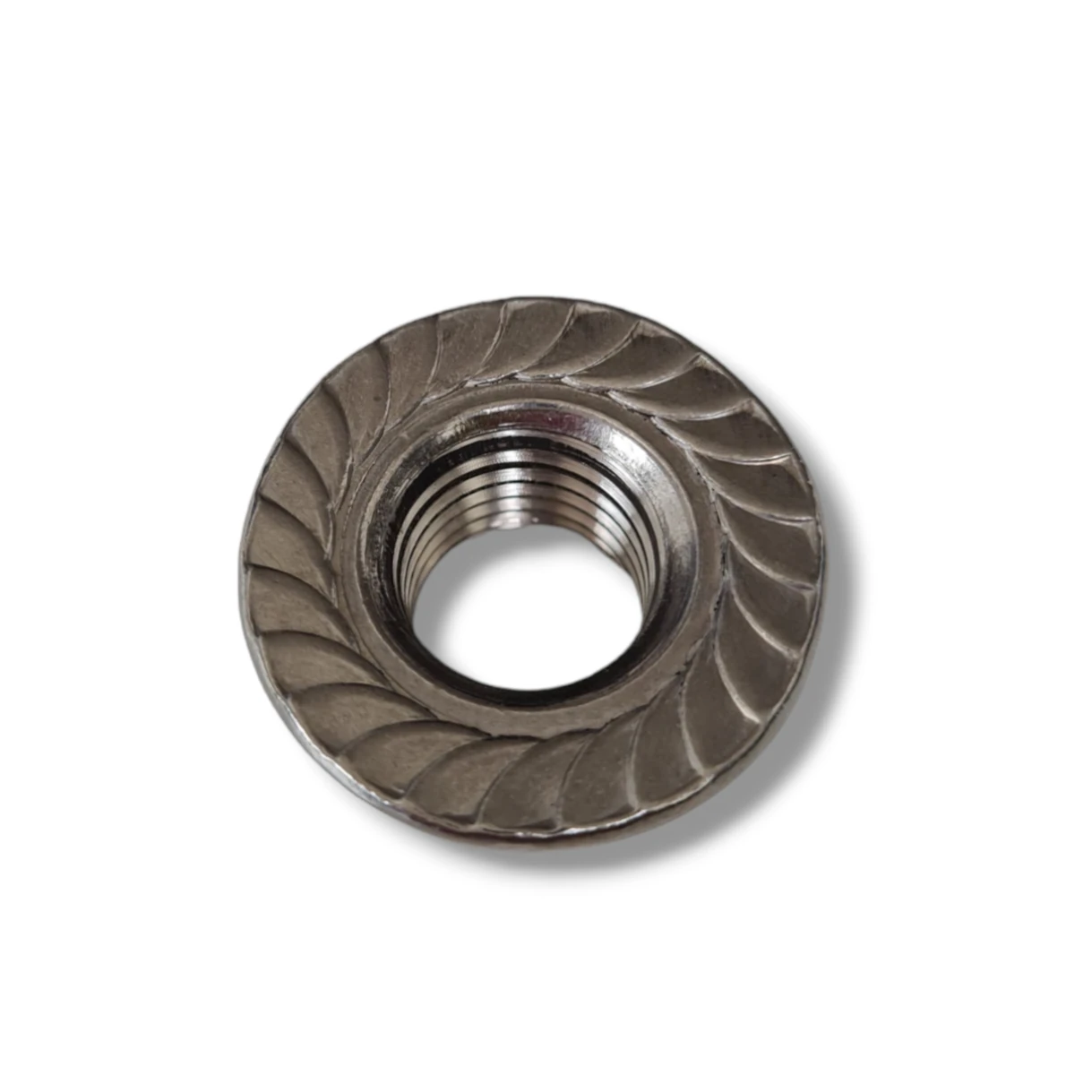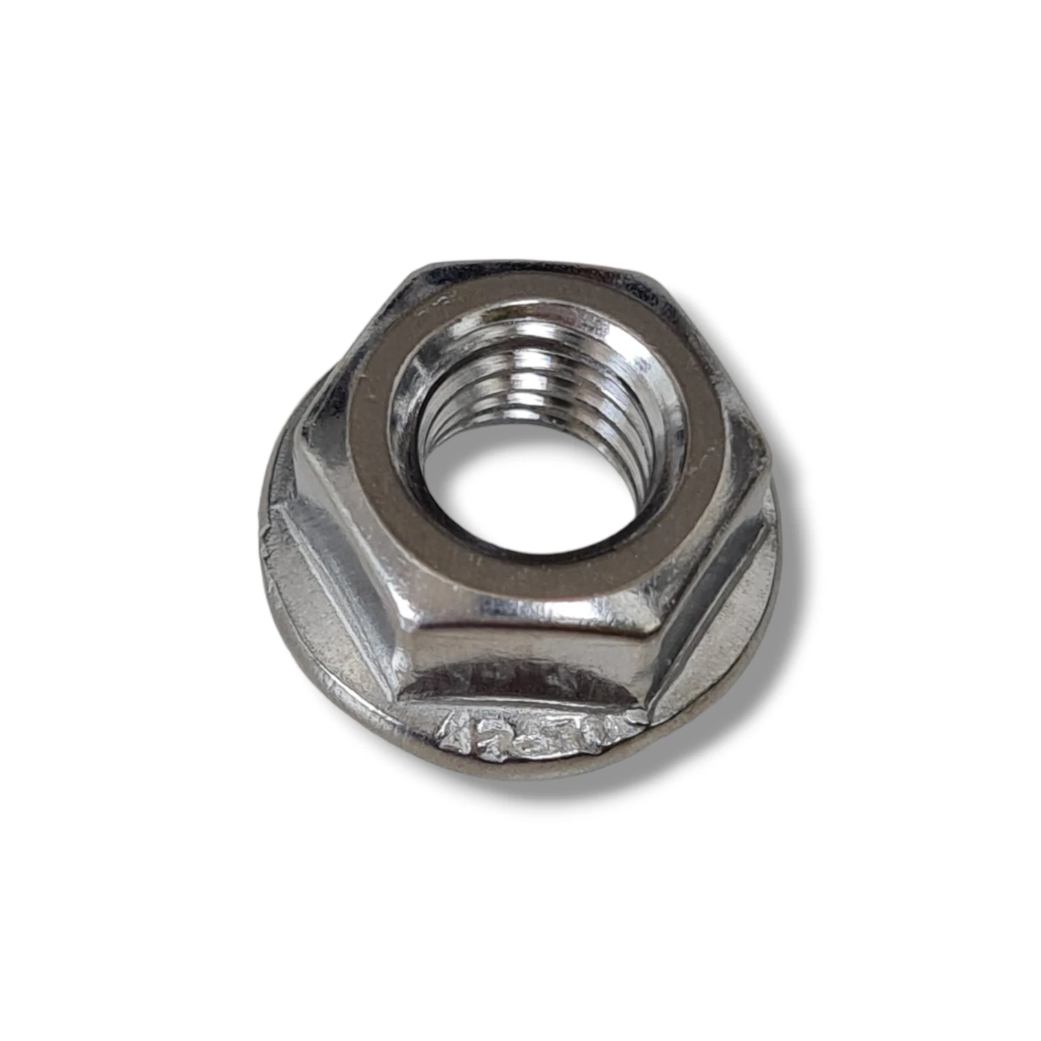 Geflanschte Sechskantmutter DIN 6923 mit Kerbflansch M8 aus Edelstahl A2 1.4301, für Photovoltaikanlagen.