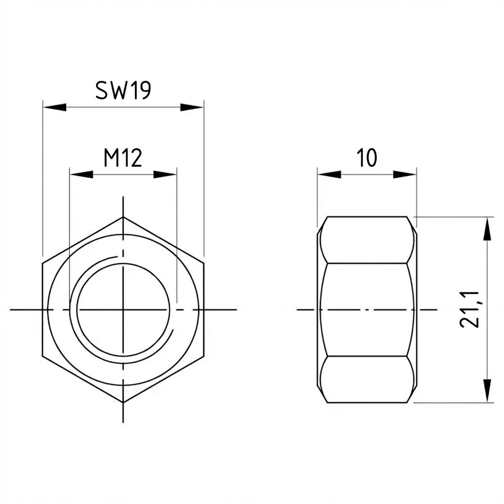 Die Konformität mit der Norm DIN 934 bedeutet eine standardisierte sechskantige Form, die ein einfaches Anziehen mit einem Standardschlüssel ermöglicht. Die Mutter ist wiederverwendbar und passt zu allen metrischen M12-Schrauben mit Rechtsgewinde.