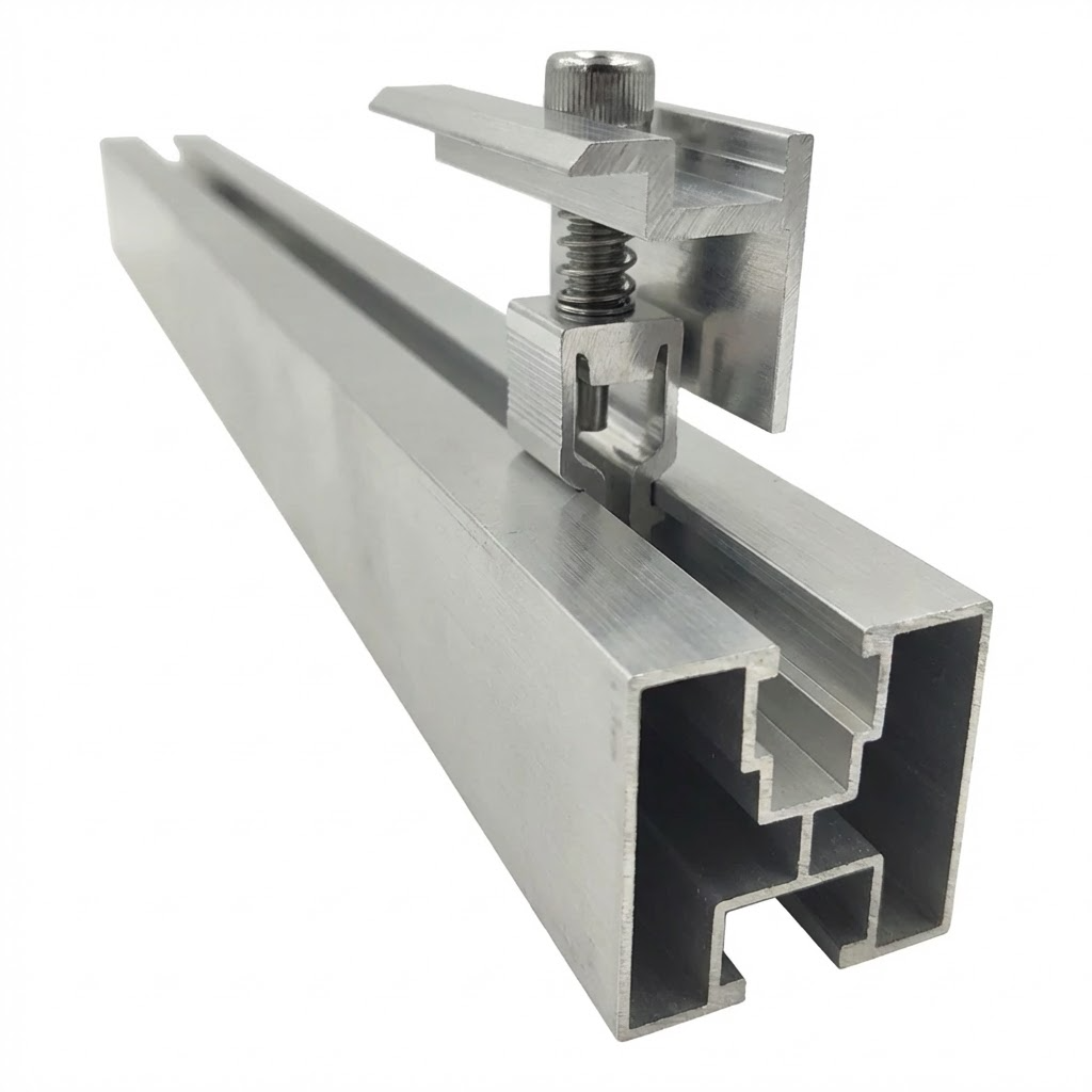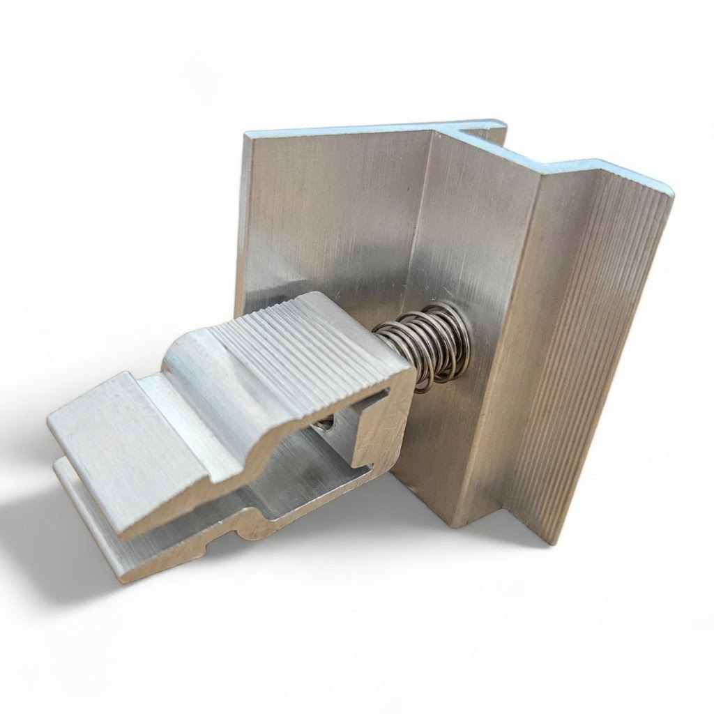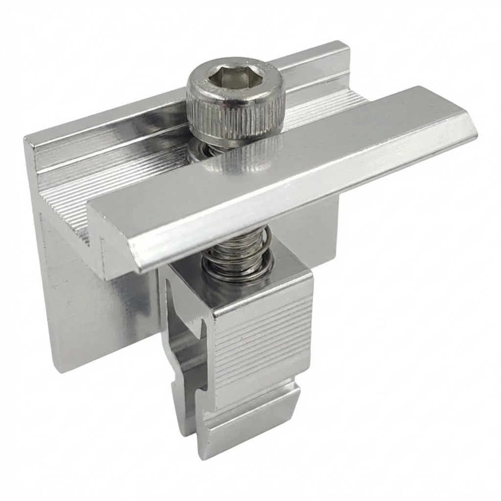 Die Klammer ist aus Aluminium 6060 mit silberner Eloxierung gefertigt, was eine hohe Korrosionsbeständigkeit sowie ein klassisches, neutrales Erscheinungsbild gewährleistet, das zu den meisten PV-Anlagen passt. Die silberne Oberfläche harmoniert hervorragend mit Aluminium-Montageprofilen und sorgt für eine einheitliche Ästhetik des gesamten Systems.