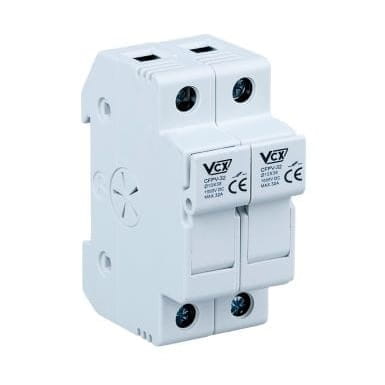 Sicherungssockel 2P 32A 10x38 1000V DC CFPV-32 CF PV32 2P VCX für Schmelzsicherungseinsätze mit den Abmessungen 10x38, konzipiert für den Einsatz in Photovoltaikanlagen. Die maximal zulässige Betriebsspannung beträgt 1000V DC und der höchstzulässige Strom 32A.