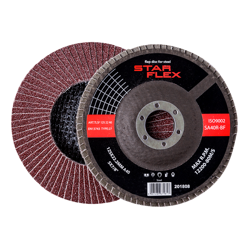 Fächerscheibe Star Flex T29 mit Durchmesser 125 mm und Körnung 40 — hochwertiges Schleifwerkzeug mit Korund-Beschichtung, entwickelt für intensive Stahlbearbeitung. Die abgewinkelte T29-Konstruktion gewährleistet optimalen Materialkontakt bei einem Arbeitswinkel von 10°–25°, was sich in effektivem Kantenschleifen, Anfasen und Entfernen von Schweißnähten ohne übermäßigen Druck niederschlägt.