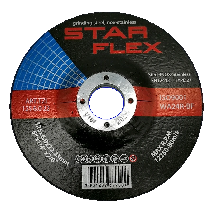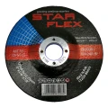 Schruppscheibe StarFlex 125 mm mit erhöhter Härte, bestimmt zum Schleifen von Baustahl sowie rostfreiem Stahl (INOX). Dank der Kornbezeichnung WA24R-BF gewährleistet sie aggressiven und gleichzeitig kontrollierten Materialabtrag — bewährt sich bei der Schweißnahtbearbeitung, beim Kantenfasen, Entgraten und Oberflächenschleifen. Die Scheibe vom Typ T27 (mit abgesenktem Zentrum) ermöglicht komfortables Arbeiten im Winkel, und die Glasfaserverstärkung garantiert Sicherheit auch bei intensiver Nutzung.