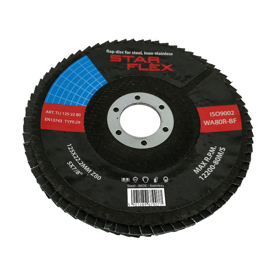 Starflex Fächerscheibe T29 125 mm mit Körnung 80 ist eine hochwertige Fächerscheibe mit Zirkonoxid-Belag, entwickelt für die professionelle Bearbeitung von rostfreiem Stahl (INOX) sowie Kohlenstoffstahl. Die abgewinkelte Ausführung (Typ 29) ermöglicht präzise Arbeiten an Kanten, Ecken und Schweißnähten — überall dort, wo Winkelkontrolle und effektive Materialabnahme entscheidend sind.
