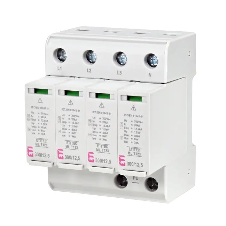 Überspannungsableiter Typ 1+2+3 (B+C+D) 4P 20kA 1,5kV ETITEC ML T123 300/125 4+0 002440667 ETI ist eine fortschrittliche Schutzeinrichtung, die zum Schutz elektrischer Anlagen vor Überspannungen eingesetzt wird.