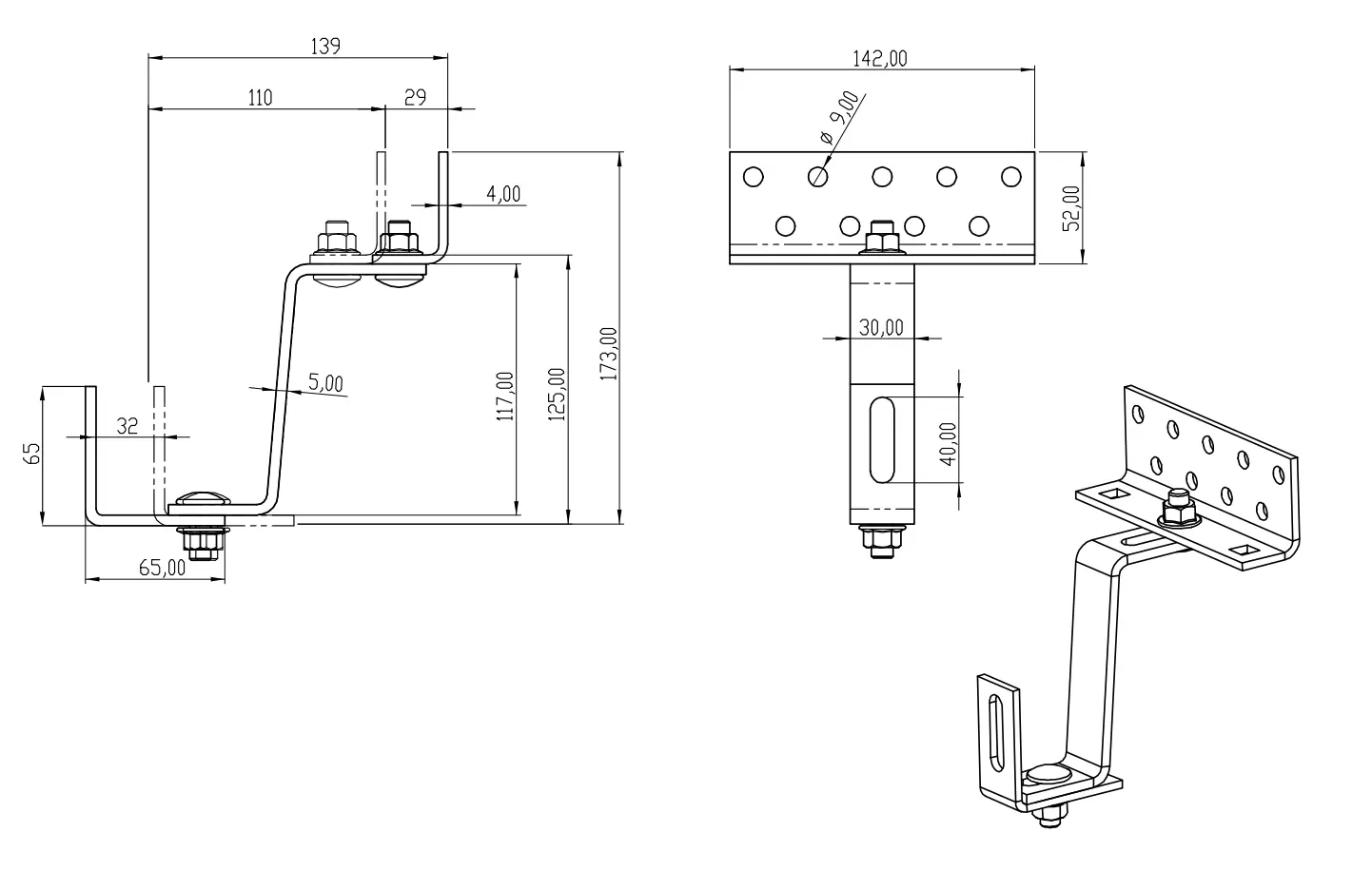 - Der breite Winkel ist aus 5mm Blech gefertigt, der Flachstahl-Z-Träger hat 30x5mm und der verstellbare Winkel hat die Abmessungen 30x4mm.