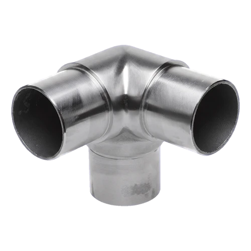 Verbinder Eckdreieck bestimmt für den Bau von Geländern aus Rohren mit Durchmesser 42,4 mm und Wandstärke 2 mm. Das Element verbindet drei Rohrabschnitte, die in einem Punkt zusammenlaufen — zwei horizontale Arme im Winkel von 90° und ein vertikaler Arm (Pfosten). Durch diese Lösung ist es möglich, eine Geländerecke mit gleichzeitiger Verbindung von Handlauf und Pfosten in einem ästhetischen Konstruktionsknoten zu erstellen.