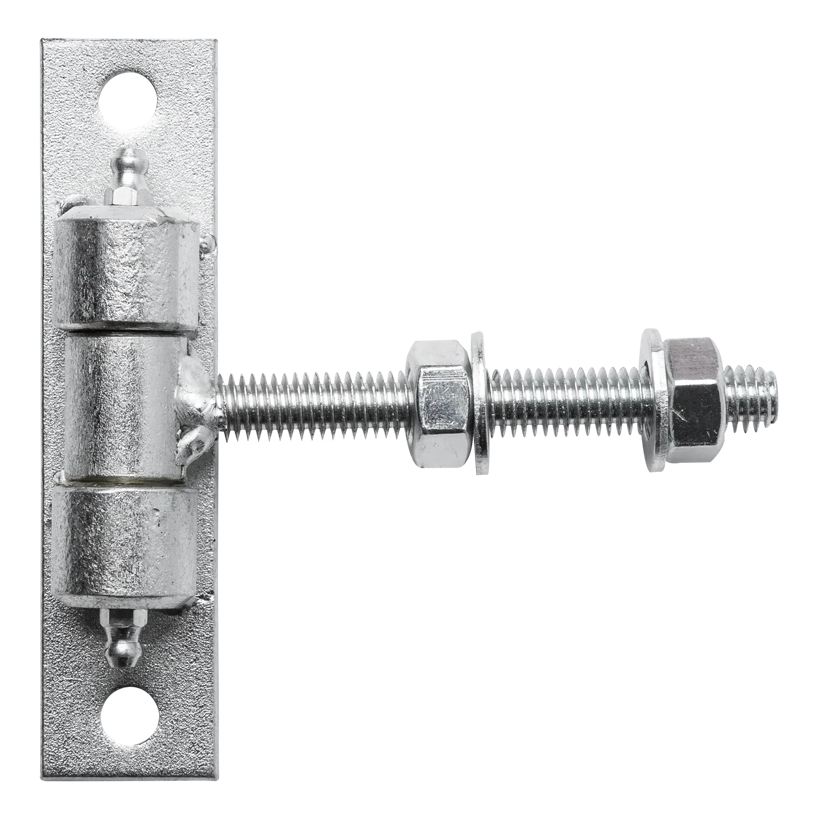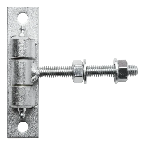 Verstellbares Scharnier mit M12 Gewinde für die Montage von Flügeltoren und Pforten. Die robuste, verzinkte Stahlkonstruktion bietet hohe Korrosionsbeständigkeit und langlebigen Betrieb unter Außenbedingungen. Dank der Verstellmutter am Gewindestift kann die Torflügelstellung jederzeit korrigiert werden — sowohl direkt nach der Montage als auch später, z.B. nach Durchhängen der Konstruktion oder thermischen Verformungen bei extremen Temperaturen.