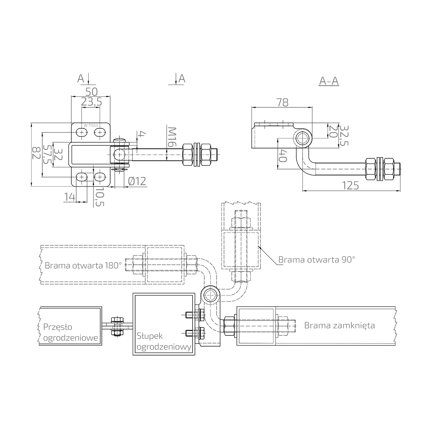 Das verstellbare gebogene Torband M16 ist ein massives, vollständig verstellbares Scharnier für die Montage von Toren, Pforten und Zaunttüren. Dank der gebogenen Armkonstruktion ermöglicht es eine vollständige 180°-Öffnung des Torflügels, was eine freie Durchfahrt und Passage auch in engen Durchgängen gewährleistet. Die Verstellmöglichkeit des Abstands zwischen Pfosten und Torflügel erlaubt eine präzise Anpassung der Torstellung nach der Montage – ohne Arbeitsunterbrechung und erneutes Bohren.