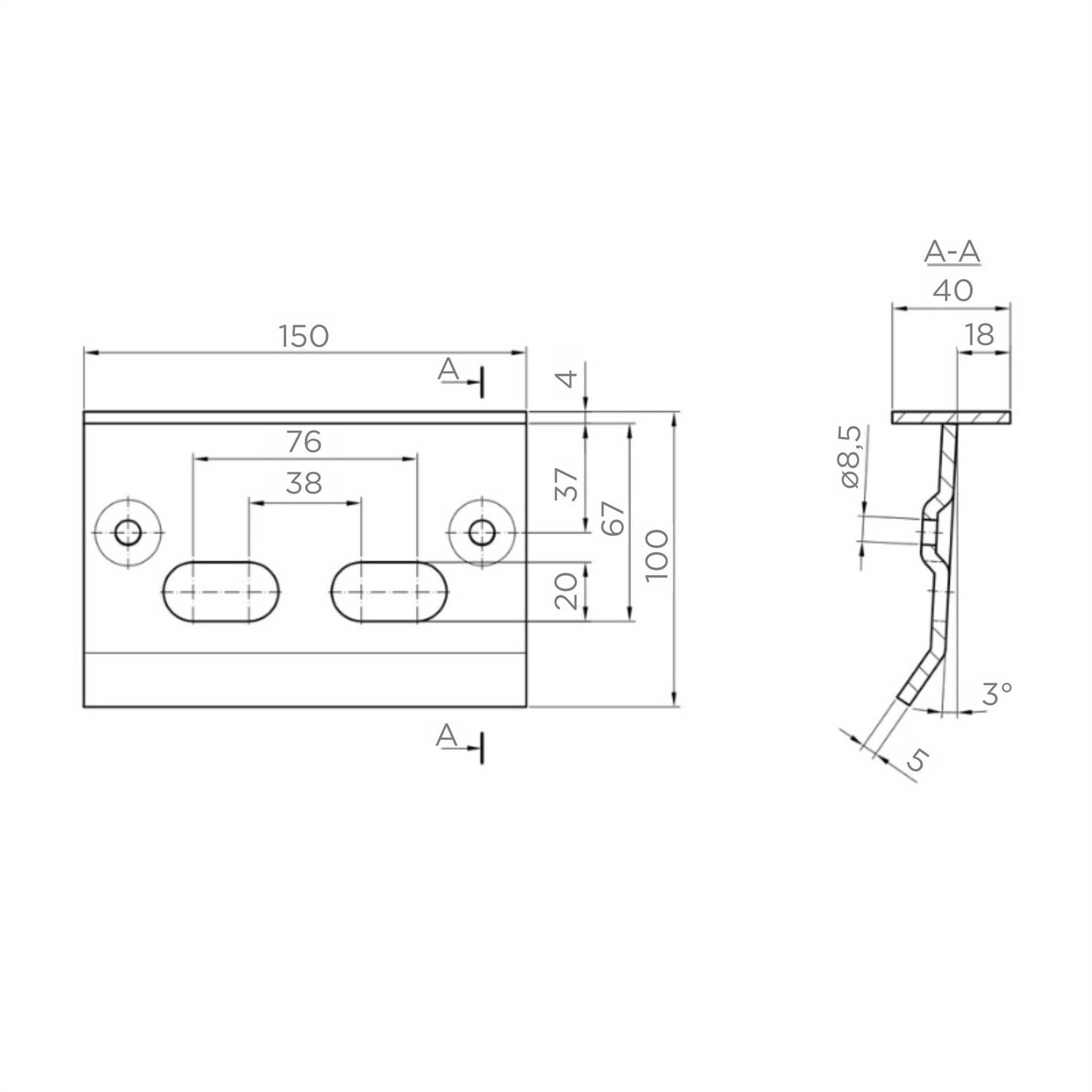 Der Anschlag ist mit Riegellöchern (Langlöcher) sowie Montagelöchern für Senkschrauben ausgestattet, was eine sichere Befestigung und Zusammenarbeit mit einem Torriegel ermöglicht. Die profilierte Biegung mit einem Winkel von 3° im unteren Bereich sorgt für stabiles Anliegen am Untergrund und ästhetisches Erscheinungsbild der Montage.