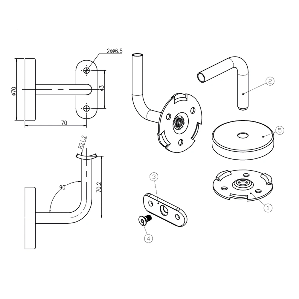 Die Konsole besteht aus fünf Elementen: Wandmontagebasis, L-förmigem Arm mit 90°-Biegung, Sattel (Handlauf-Montageplatte), Schraube mit Senkkopf sowie Abdeckrosette. Die Abdeckrosette mit einem Durchmesser von 70 mm verdeckt die Montagebasis und verleiht dem Ganzen ein elegantes, sauberes Aussehen.