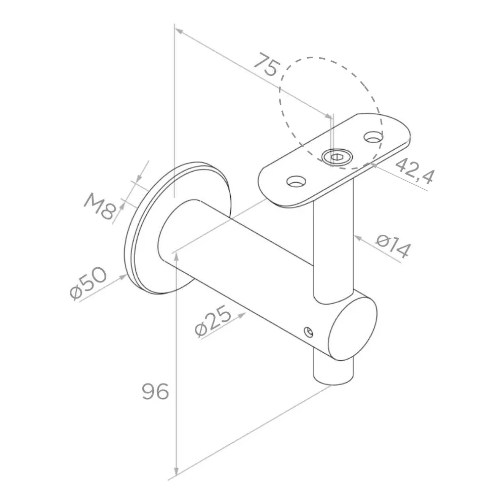 Die Befestigung besteht aus einer Wandrosette mit Durchmesser 50 mm, einem waagerechten Arm mit Durchmesser 25 mm sowie einem senkrechten Stutzen mit flachem Montageblech, das mit Löchern zur Verschraubung des Handlaufs ausgestattet ist. Das Befestigungsgewinde M8 ermöglicht sichere Verankerung in der Wand. Das Element bewährt sich hervorragend als Abschluss von Glasbalustraden sowie klassischen Rohrsystemen — es hebt die optischen Qualitäten der Konstruktion und gewährleistet die Einheitlichkeit des gesamten Handlaufsystems.