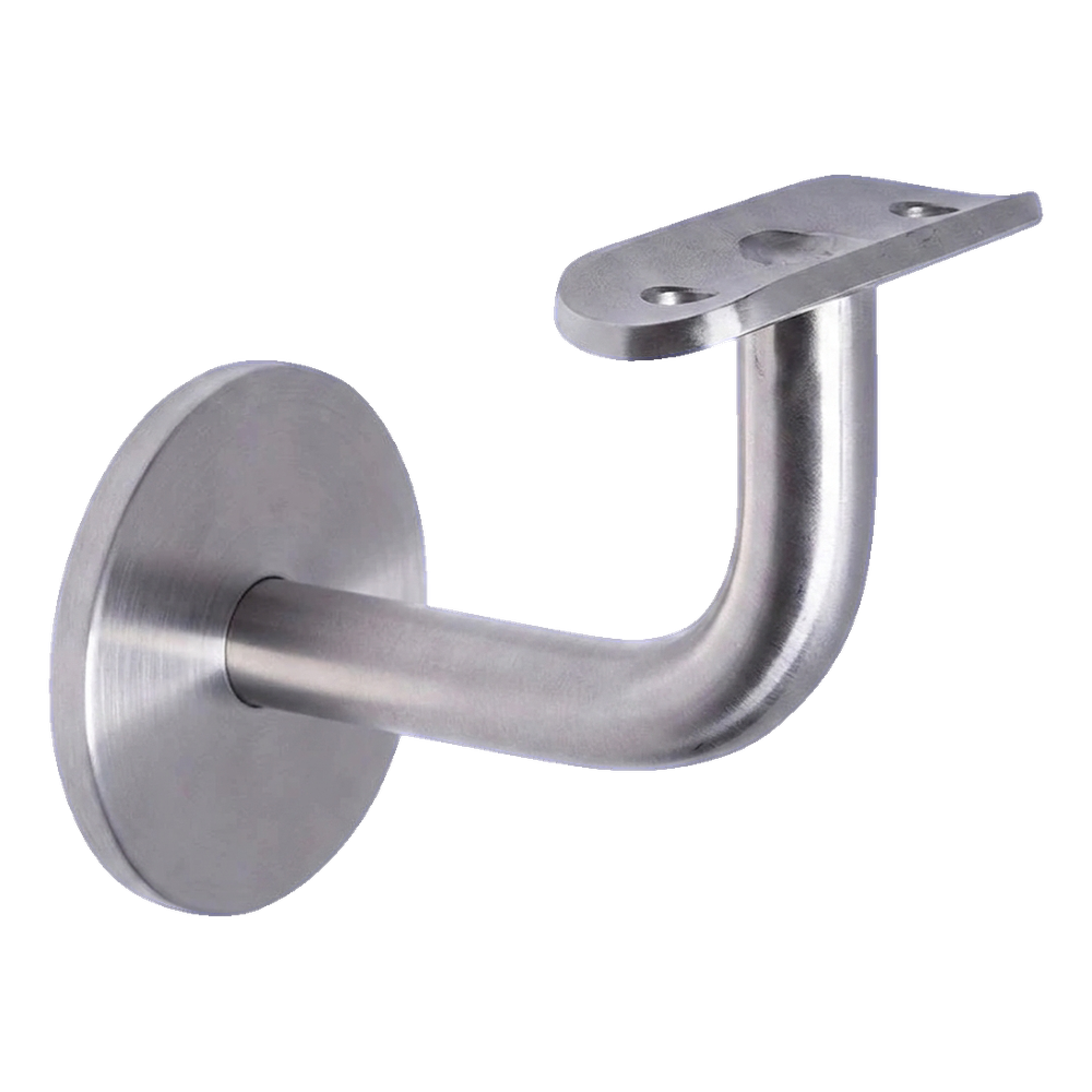 Der Halter besteht aus einer runden, an der Wand befestigten Rosette, einem gebogenen Tragarm sowie einem Montageblech (Sattel) zur Verschraubung des Handlaufrohrs. Das Montageblech mit einem Befestigungsloch ist im Lieferumfang enthalten. Wandbefestigungsschrauben sind nicht enthalten — wählen Sie diese entsprechend dem Untergrund (Beton, Ziegel, Gipskartonplatte).