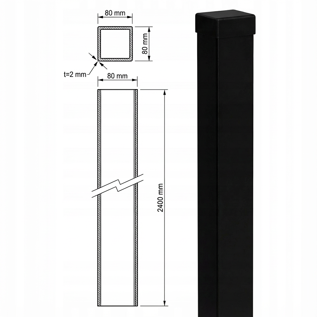 Zaunpfosten 80x80x2 mm, Länge 2,4 m, schwarz