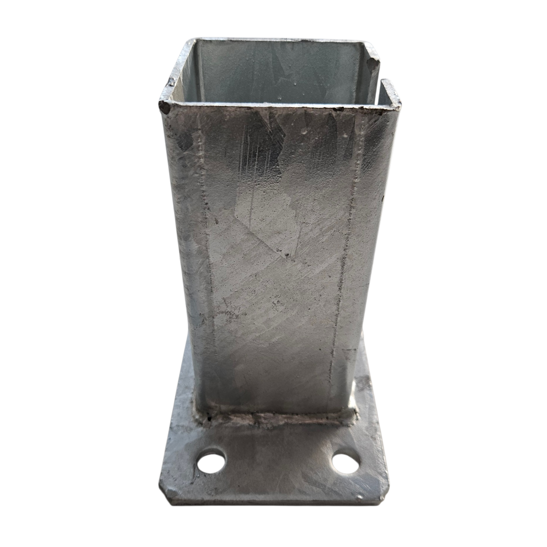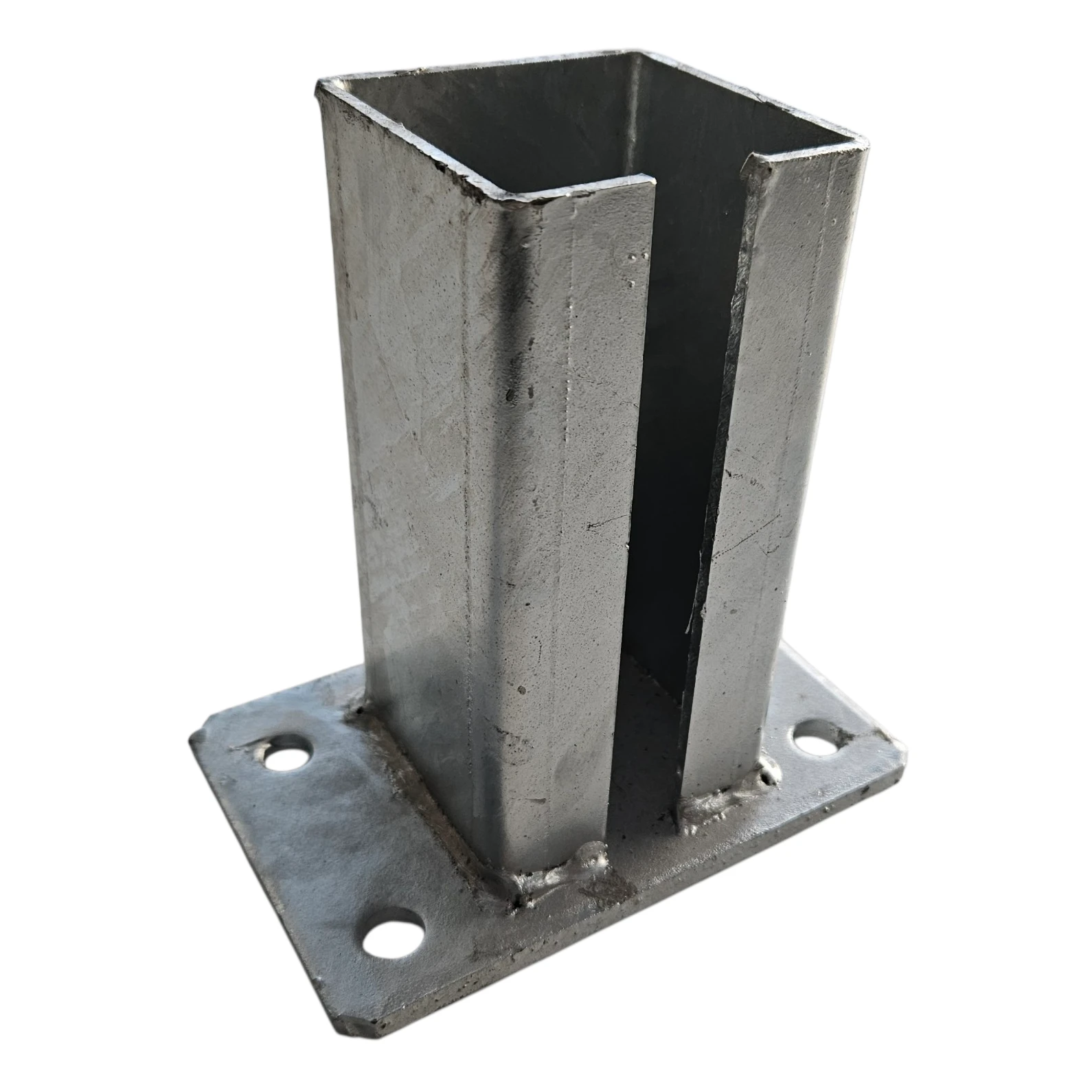 Die Konstruktion besteht aus einem offenen quadratischen Profil 73×73 mm (angepasst an Pfosten 80×80 mm), das an eine massive Montageplatte mit vier Löchern für Ankerbolzen angeschweißt ist. Die Kehlnaht an der Profilbasis garantiert eine solide Lastübertragung. Der vertikale Schlitz im Profil ermöglicht eine präzise Anpassung und Toleranzausgleich des Pfostens.