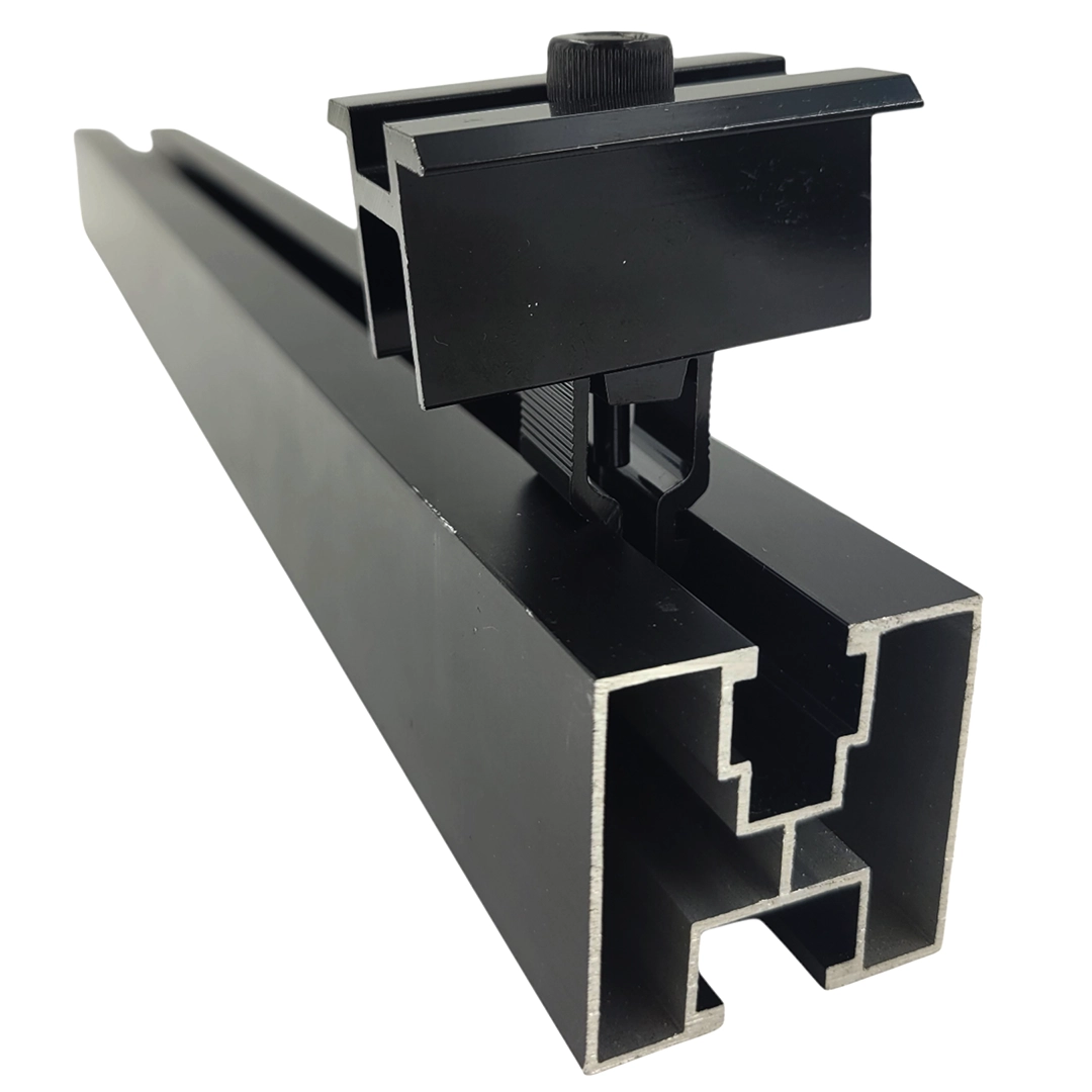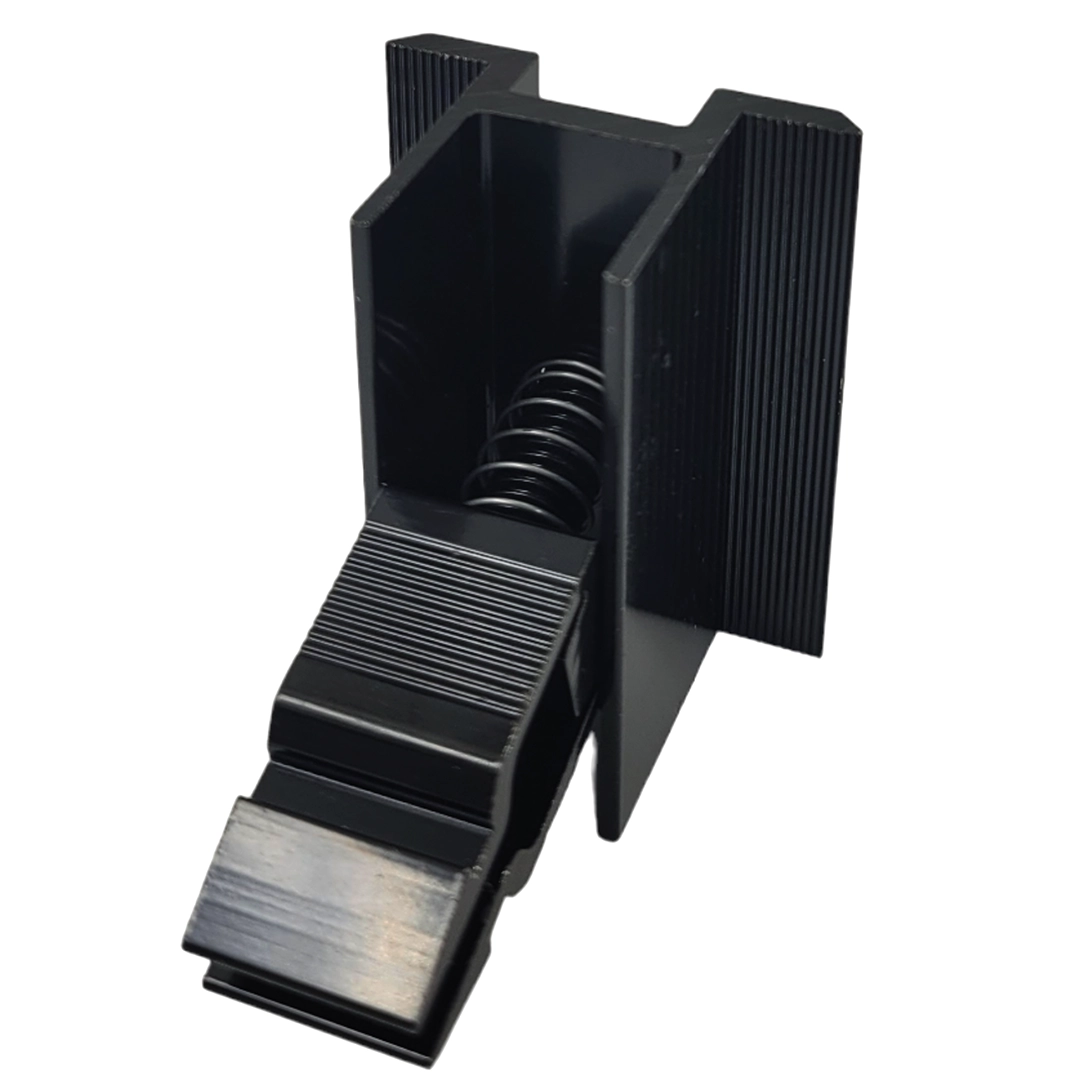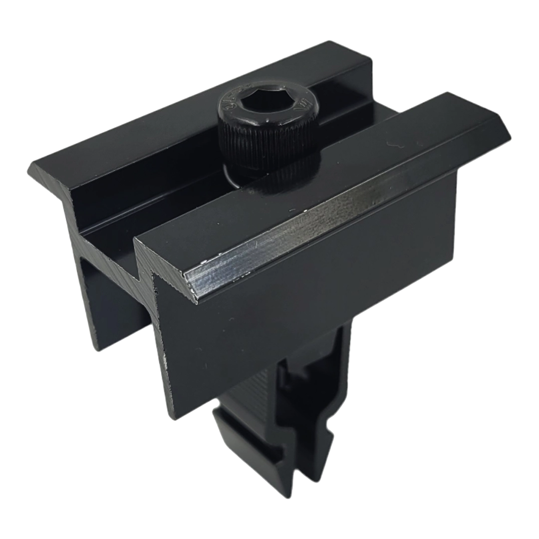 Mitteldruckklemme aus Aluminium 6060 schwarz - Klickverschluss mit Mutter und Schraube, schwarz lackiert L50 (Typ 2) zur Befestigung von Photovoltaik-Modulen.